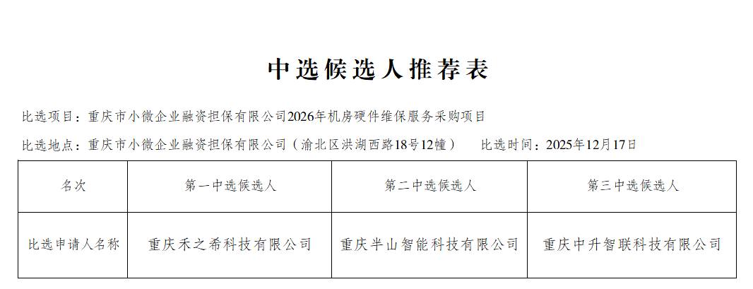 重庆市小微企业融资担保有限公司2026年机房硬件维保服务采购项目中标公示