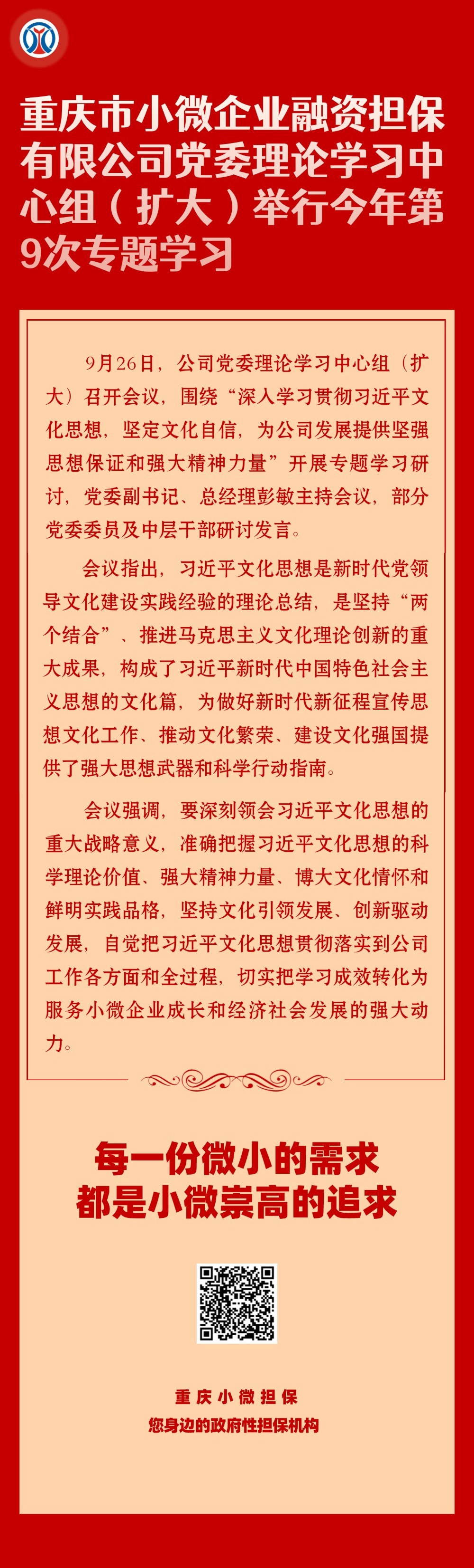 重庆市小微企业融资担保有限公司党委理论学习中心组(扩大)举行今年第9次专题学习